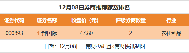 从券商推荐家数来看,12月8日有23家上市公司得到券商推荐,其中亚钾国际获得2家推荐,维信诺、威海广泰获得1家推荐。
