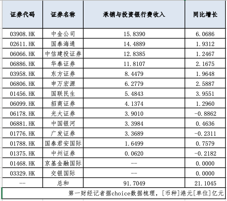 第一财经据choice梳理,目前在港上市的13家券商(已披露业绩),2025年上半年的承销与投资银行费用收入合计91.7亿港元,较去年同期的70.6亿港元有明显提升。
