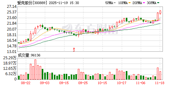 截至11月18日收盘,爱克股份每股报25.8元,上涨2.71%,公司最新市值为57亿元。